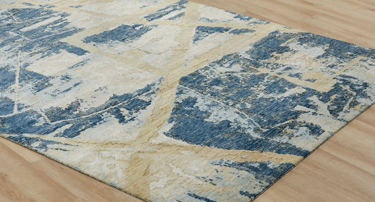 Alfombra de lana Ventura VN1394 en tonos azules denim y arenas cálidas, tejida a máquina